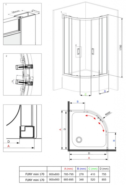 Zástěnu můžete instalovat jak na čtvrtkruhovou vaničkou o rozměru 90x90 (radius R55), tak přímo na vydlážděnou podlahu vaší koupelny.