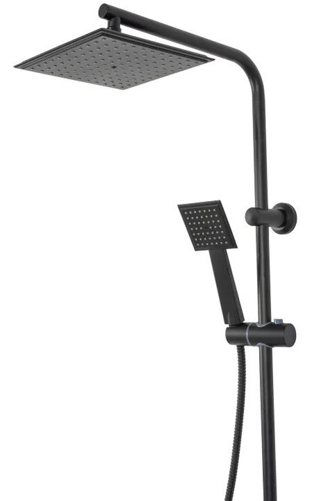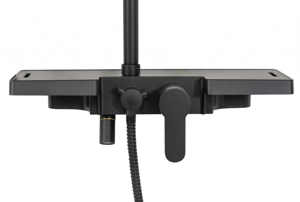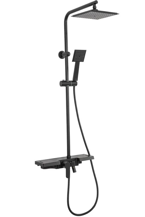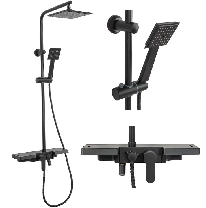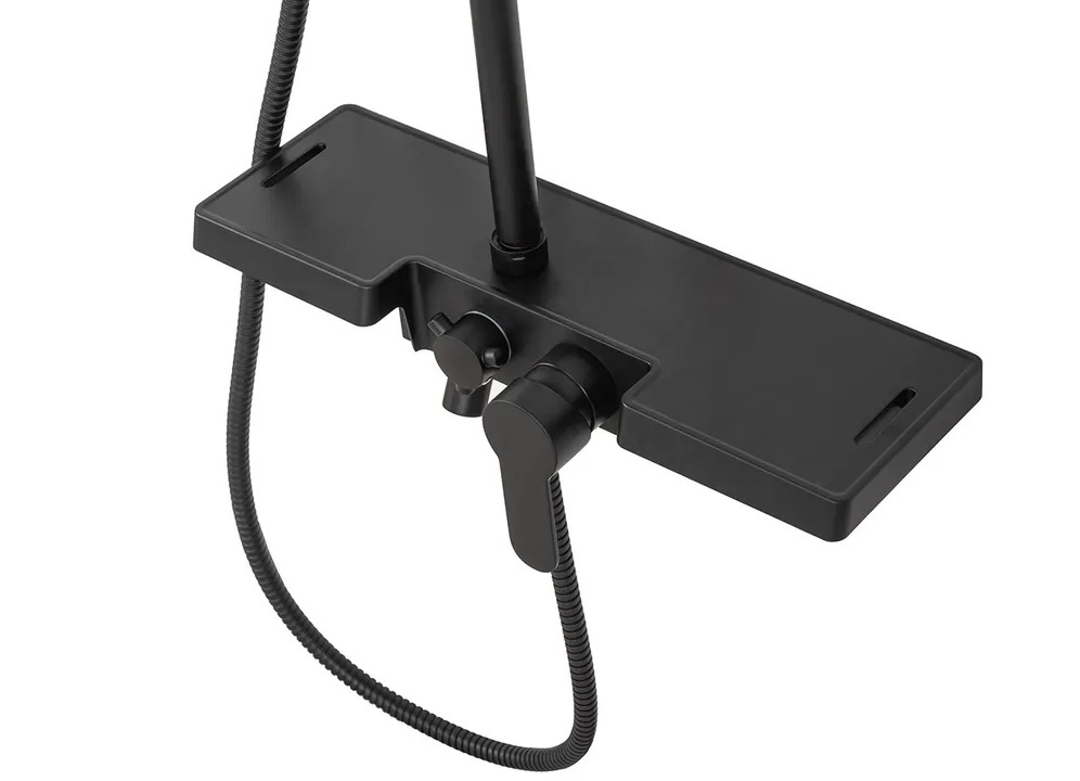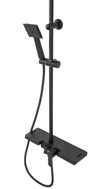 Sprchová souprava s vodovodní baterií a poličkou. Vše vyladěno do černé barvy a moderního designu.
