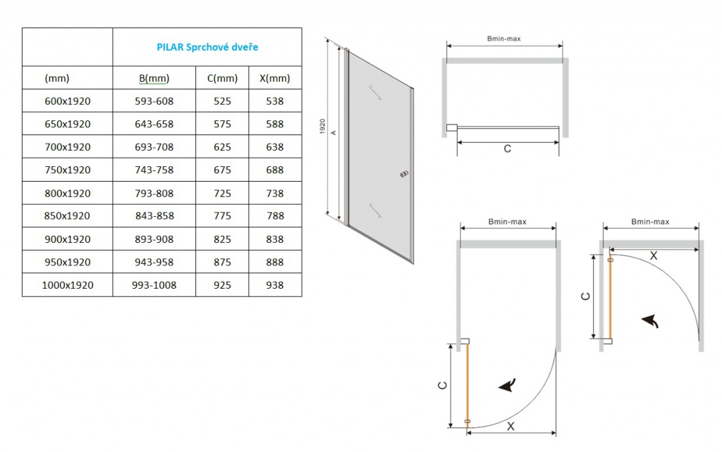 Bytelné panty dveří Pilar umožňují otevřít dveře jak dovnitř tak ven ze sprchového koutu (nutné zvolit již při montáži). Díky nastavovacímu profilu je možno dveře instalovat i do ne zcela rovné sprchové niky (rozmezí cca 2 cm).