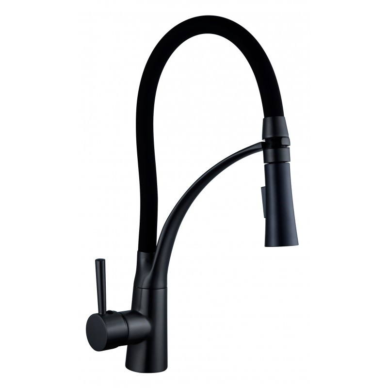 Krásná designová dřezová baterie s gumovou flexibilní hadicí pro pohodlnou manipulaci nejen při opláchnutí dřezu.