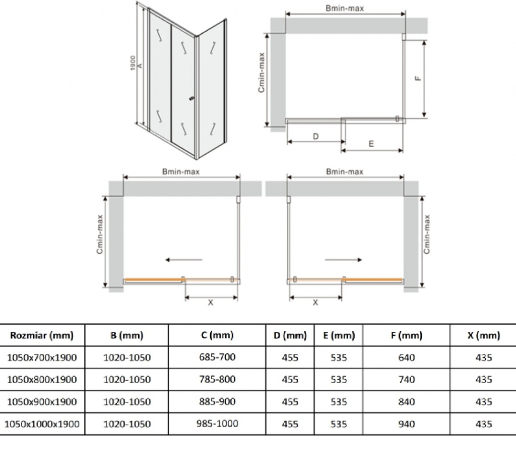 Zástěnu nabízíme v kombinacích od rozměru dveří 90 až po 150 cm a bočnice od 70 po 100 cm.