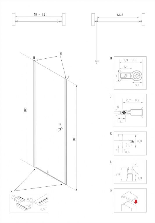 Výška dveří je 185 cm. (není problém k umístění dveří i při vyzděném soklu ve sprchové nice)