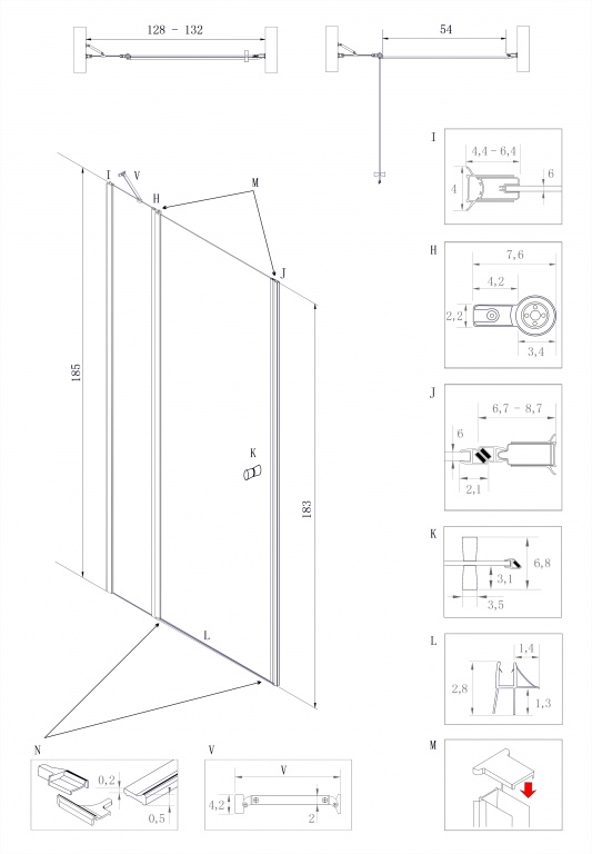 Výška dveří je 185 cm. (není problém k umístění dveří i na vyzděný sokl sprchového koutu)
