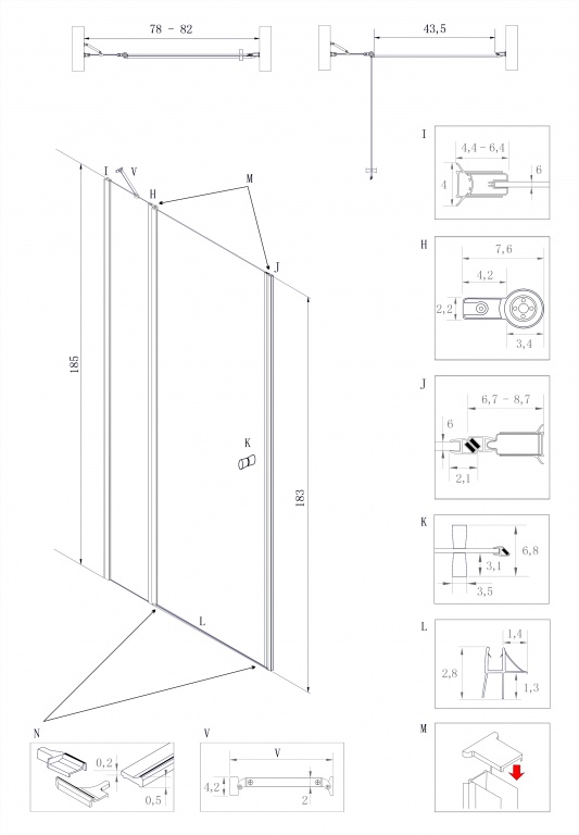 Výška dveří je 185 cm. (není problém k umístění dveří i na vyzděný sokl sprchového koutu)