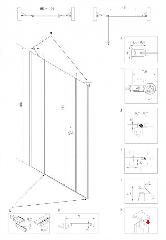 Výška dveří je 185 cm. (není problém k umístění dveří i na vyzděný sokl sprchového koutu)
