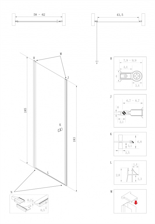 Výška dveří je 185 cm. (není problém k umístění dveří i při vyzděném soklu ve sprchové nice)