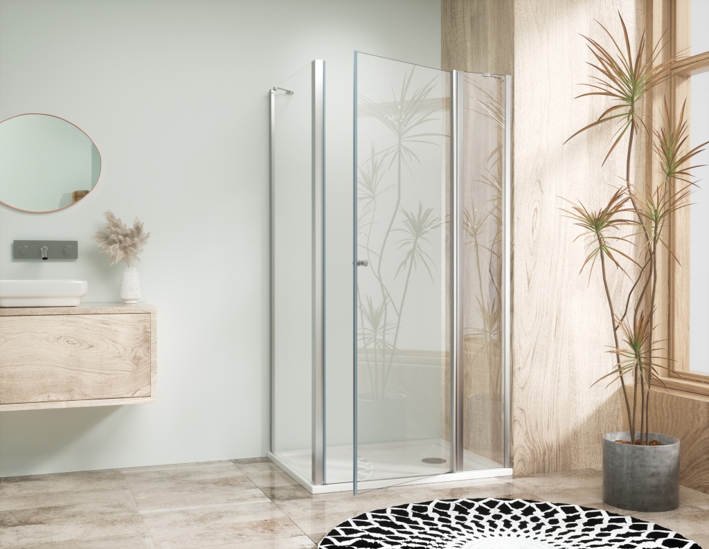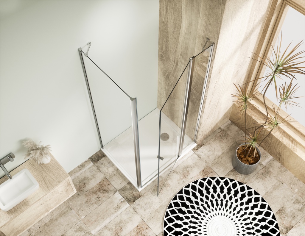 Moderně zpracovaný sprchový kout Alfa-V Line Combi vytvořený z otevíracích dveří, pevné stěny v rovině a pevné boční stěny.