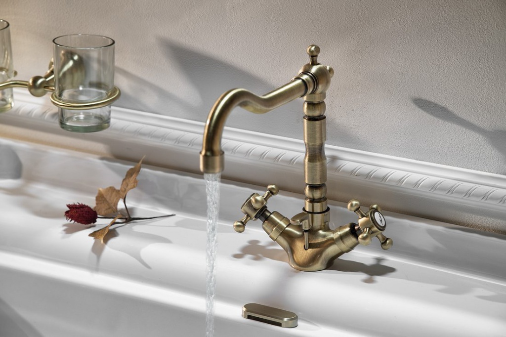 ANTEA stojánková umyvadlová baterie s retro hubicí s výpustí, bronz Sapho