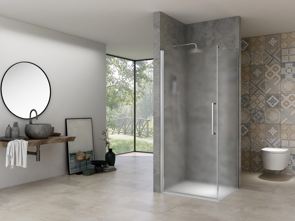 Křídlo sprchových dveří AVER se otevírá směrem ven - do prostoru koupelny.
