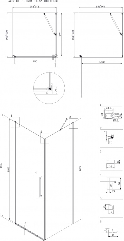 Montážní rozměr dveří je 95,4 - 97,4 cm, pevnou boční stěnu je možné nastavit v rozměru 97 - 99 cm.