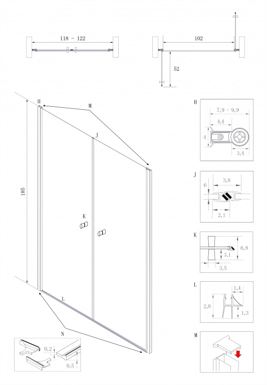 Výška dveří je 185 cm. (není problém k umístění dveří i při vyzděném soklu ve sprchové nice)