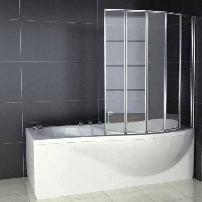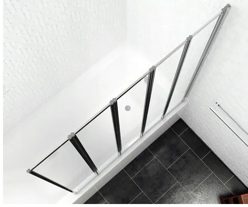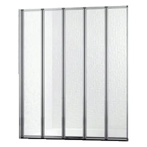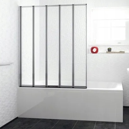 Skládací vanová zástěna DANCE 5 je složena z pěti dílů skleněných tabulí zasazených v chromových rámech.