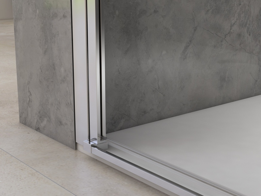 Skleněné tabule drží pevně "v rukou" leštěný hliníkový profil s CHROMovým povrchem. Profil je tvarovaný v moderním hranatém designu doplněný o horní krytku, aby se dovnitř nedostala ani kapka. Konstrukční řešení zdvihacího pantu je špičkovým řešením otevíracích dveří u sprchových koutů.