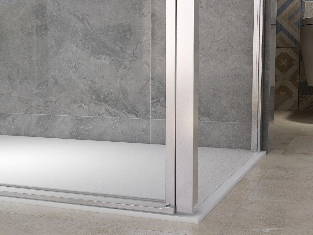 Skleněné tabule drží pevně "v rukou" leštěný hliníkový profil s CHROMovým povrchem. Profil je tvarovaný v moderním hranatém designu doplněný o horní krytku, aby se dovnitř nedostala ani kapka. Konstrukční řešení zdvihacího pantu je špičkovým řešením otevíracích dveří u sprchových koutů.
