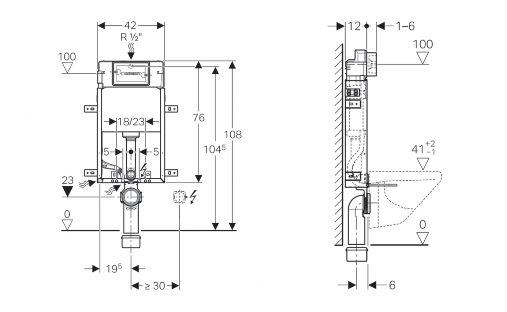 - Vybaven trubkovou chráničkou pro přívodní potrubí k připojení sprchovacích WC Geberit AquaClean