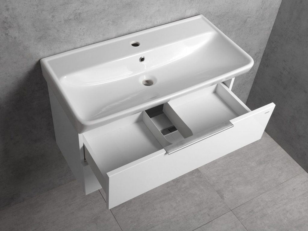 Elegantní zásuvková skříňka s umyvadlem. Skříňka již složena z výroby!! Zásuvky opatřeny kvalitními pojezdy s pomalým dojezdem a systémem automatického dovření zásuvek. Již žádné hlučné dovírání.