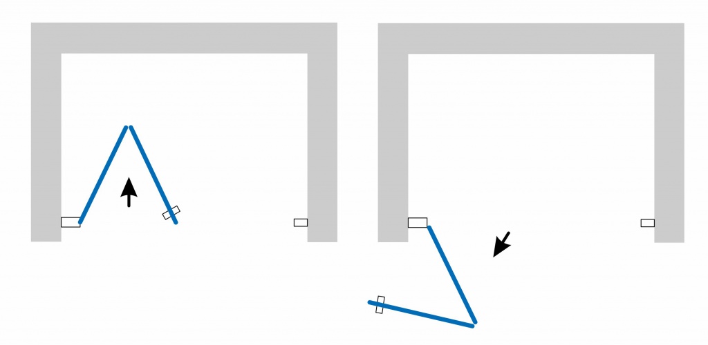 Pant křídla, který je vložený ve stěnovém profilu, se dá otáčet v obou směrech (dovnitř i ven). Dveře můžete tudíž složit jak dovnitř, tak ven ze sprchového koutu. Jednotlivá křídla jsou mezi sebou spojena pantem, který je otáčivý směrem ven.