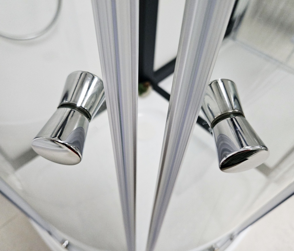 Na obou stranách zástěny je zdvojené silikonové těsnění mezi pevným a posuvným sklem. Ve stejném designu je zpracováno i magnetické těsnění mezi posuvnými skly. Magnetické dovírací těsnění celý kout spolehlivě uzavře.