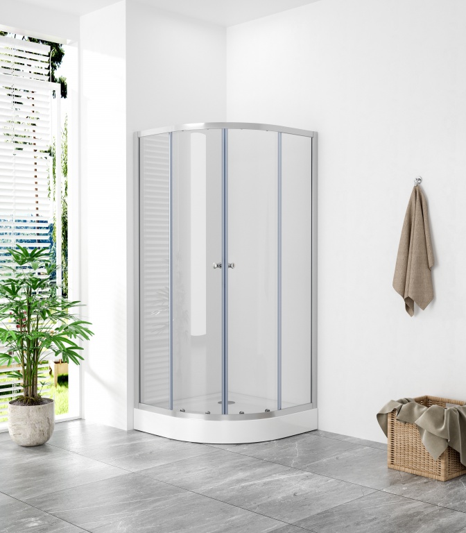 Sprchová čtvrtkruhová zástěna POINT v kombinaci s akrylátovou sprchovou vaničkou AQUA.