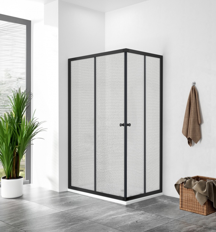Sprchová obdélníková zástěna POINT Black v kombinaci s mramorovou sprchovou vaničkou ROCKY.