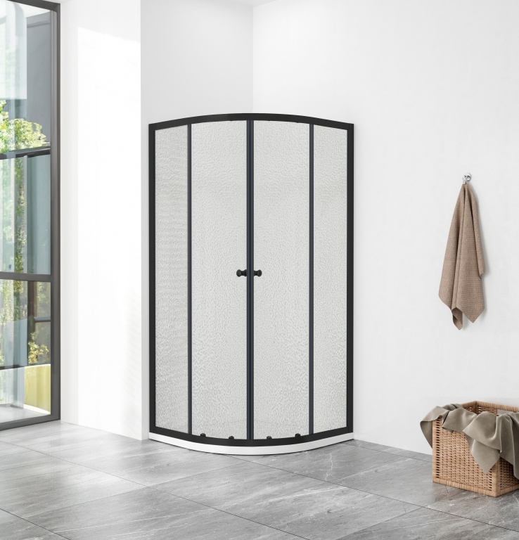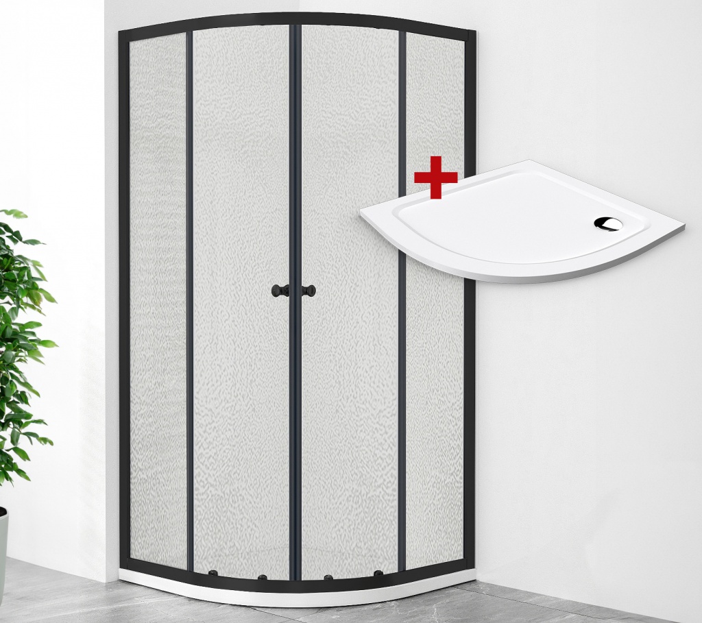 Sprchová čtvrtkruhová zástěna POINT Black v kombinaci s mramorovou sprchovou vaničkou ROCKY.