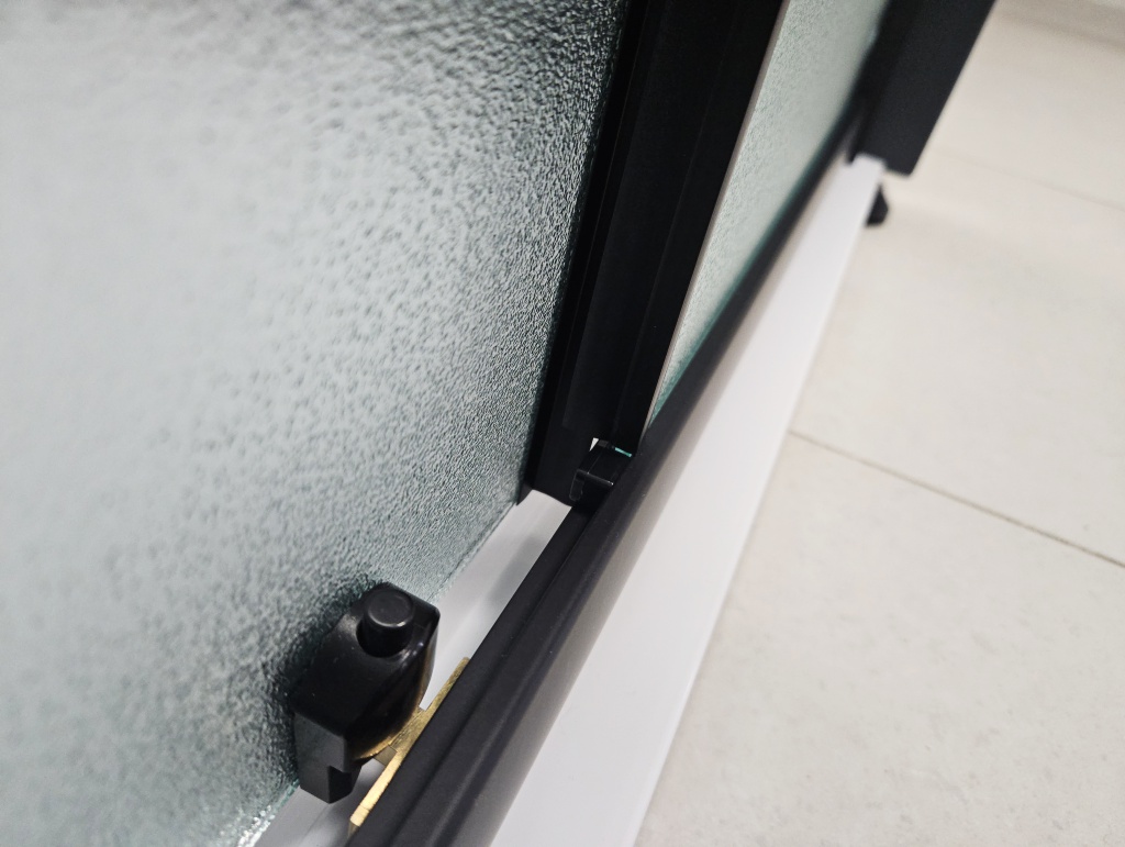 Na obou stranách zástěny je zdvojené silikonové těsnění mezi pevným a posuvným sklem. Ve stejném designu je zpracováno i magnetické těsnění mezi posuvnými skly. Magnetické dovírací těsnění celý kout spolehlivě uzavře.