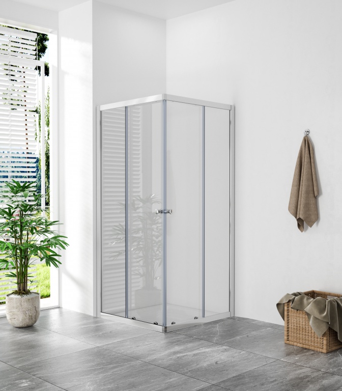 Na obou stranách zástěny je zdvojené silikonové těsnění mezi pevným a posuvným sklem. Ve stejném designu je zpracováno i magnetické těsnění mezi posuvnými skly. Magnetické dovírací těsnění celý kout spolehlivě uzavře.