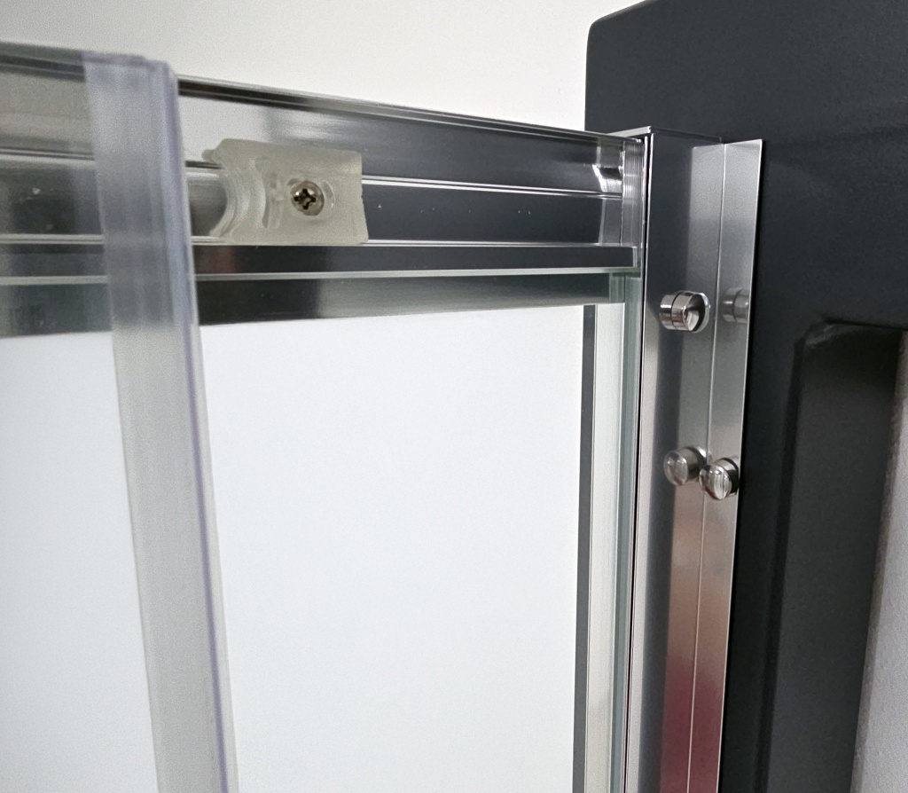 Na obou stranách zástěny je zdvojené silikonové těsnění mezi pevným a posuvným sklem. Ve stejném designu je zpracováno i magnetické těsnění mezi posuvnými skly. Magnetické dovírací těsnění celý kout spolehlivě uzavře.