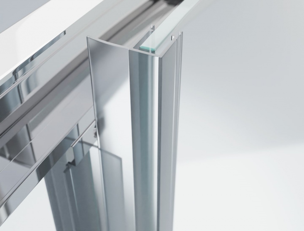 Na obou stranách zástěny je zdvojené silikonové těsnění mezi pevným a posuvným sklem. Ve stejném designu je zpracováno i magnetické těsnění mezi posuvnými skly. Magnetické dovírací těsnění celý kout spolehlivě uzavře.