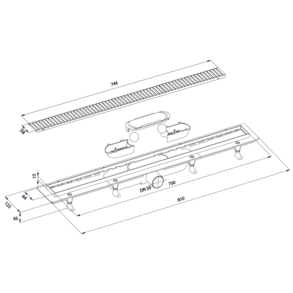 Sprchový kanálek s nerezovým roštem, DN50, 810x122x65 mm Bruckner