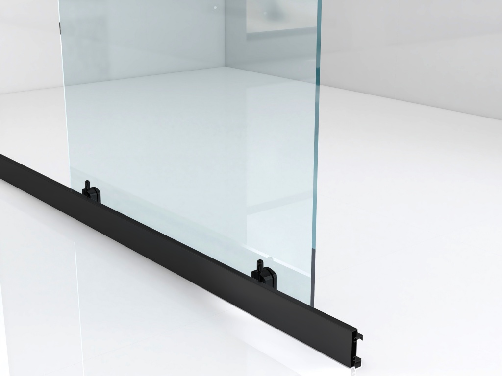 Skla této zástěny drží pevně "v rukou" hliníkový profil s ČERNÝM povrchem. Profil je tvarovaný v moderním hranatém designu.