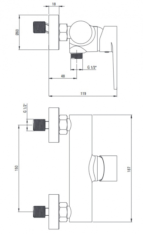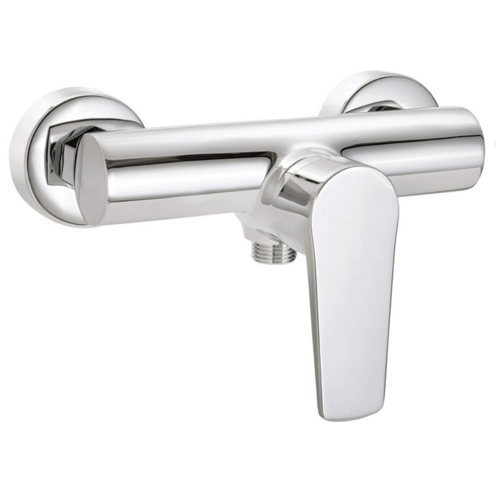 Moderní směšovací nástěnná sprchová baterie. Baterie je vybavena zpětnými ventily, které zamezují vtékání již smíšené vody zpět do vodovodního řádu.