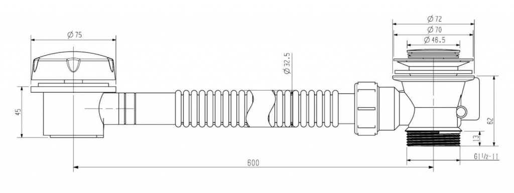 Vanová souprava s bovdenem, délka 600mm, bez sifonu, mosaz/chrom Aqualine